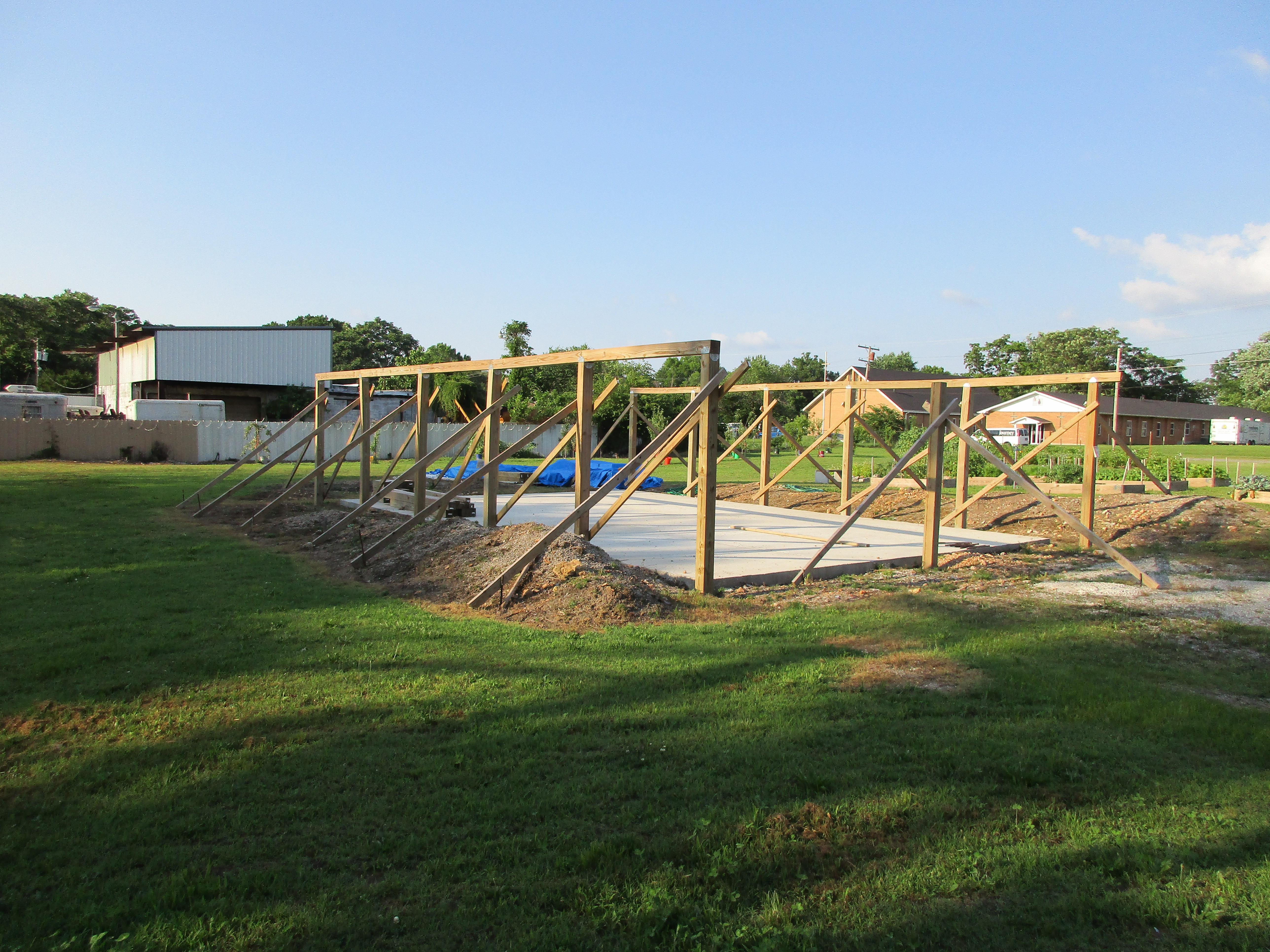 Then we have the pavilion that was started. Groups of volunteers worked for weeks to hand dig out the ground for the 25’x40’ concrete pad for the pavilion. We had a concrete specialist volunteer to help us pour the pad and the garden had just enough money to pay for the concrete. The non-profit group had volunteers come and dig out the footings for the posts and pour the concrete to set the posts.