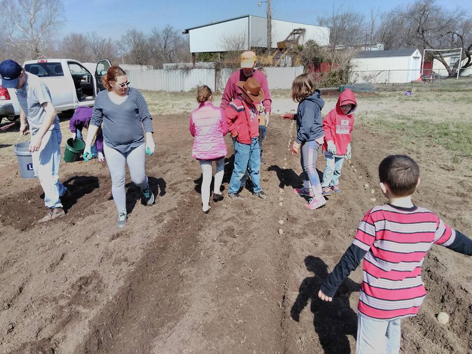 Year one accomplishments included creating twelve 4’x8’ raised beds, planting sixteen fruit trees for the orchard, putting in a raised bed for strawberries and sunflowers, getting a sign and front flower bed created, and hauling out hundreds of pounds of rocks from the 25’x30’ potato patch. We had church volunteers who brought in loads of good compost, volunteers who helped plant the orchard, volunteers who help put in the water line, and volunteers who were good enough sports to just come and pick up rocks.