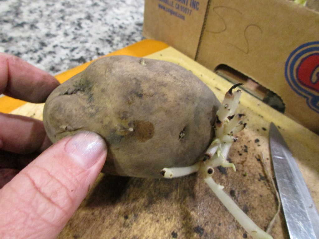 I bought three different varieties of potatoes this year: Red Worland, Yukon Gold, and Kennabec White. Usually we grow Red Pontiac, but this year the feed store switched to the Worland variety because they are supposed to be able to store longer. They all looked good a month ago when I purchased them and over the past month, they have “woken up” or the eyes have started to grow on the potatoes. This is normal and you want that growth to be started before you plant them.