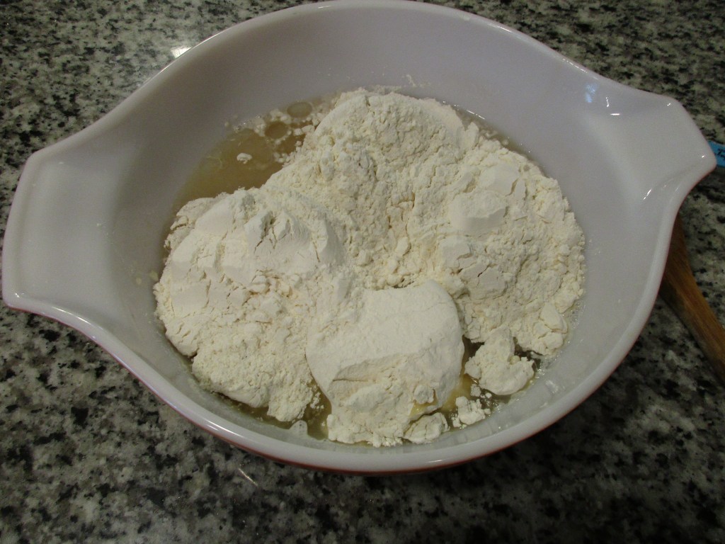 Once the yeast has been proofed, pour in the ¼ cup of oil, and mix together with the yeast mixture. Then add in the five cups of flour and salt. Mix with a strong wooden spoon. (If you don’t have a wooden spoon, wash your hands, roll up your sleeves and mix it by hand. It will be messy, but some famous bakers only do it this way.) Your dough will look a bit shaggy, but it will be fine.