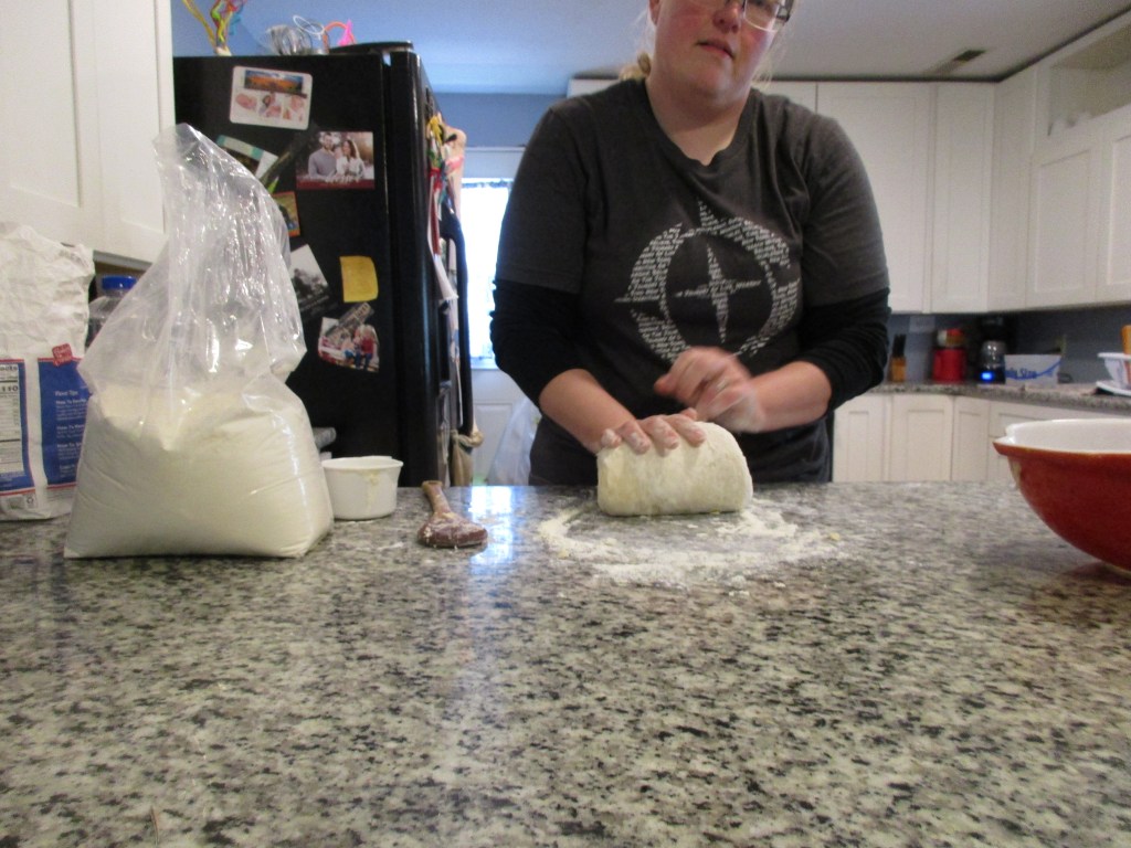 Start kneading your bread. The bread will feel gritty. You are going to keep kneading the bread until that gritty feeling is gone and the dough begins to feel smooth. This took me 10 minutes of kneading to get to that point. I added additional flour onto the work surface when the dough seemed to be sticking to the counter or to my hands.