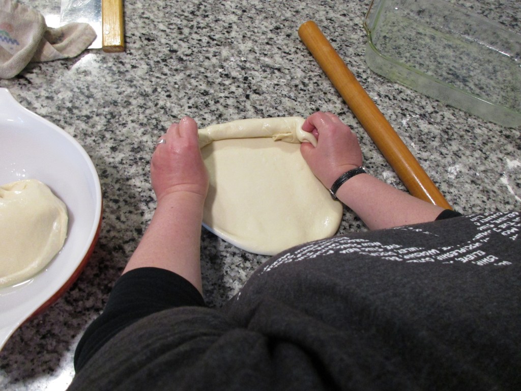 Roll out the second dough round and place them short ways into the 9×13 casserole dish. They will get wider and probably won’t get to be as tall as a loaf you buy at the store, but they will taste the same when they are cooked.