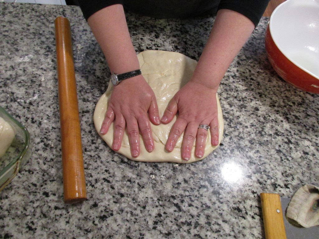 Use your hand and deflate the dough. Some people say to “punch down” the dough, but a simple hand is all that is needed to deflate the bread before shaping.