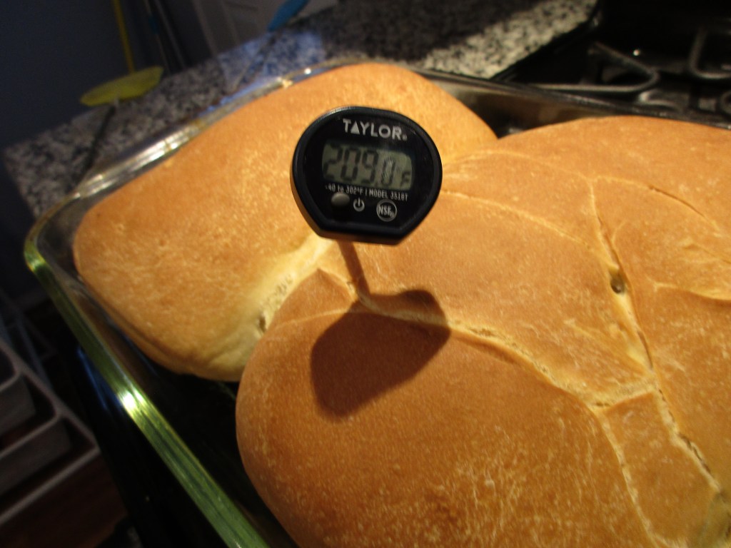 When your timer goes off, check the loaves to see if they are all the way cooked. If you have an instant read thermometer, check the temperature. Your loaf will be fully cooked when it reaches around 205-210 degrees F.