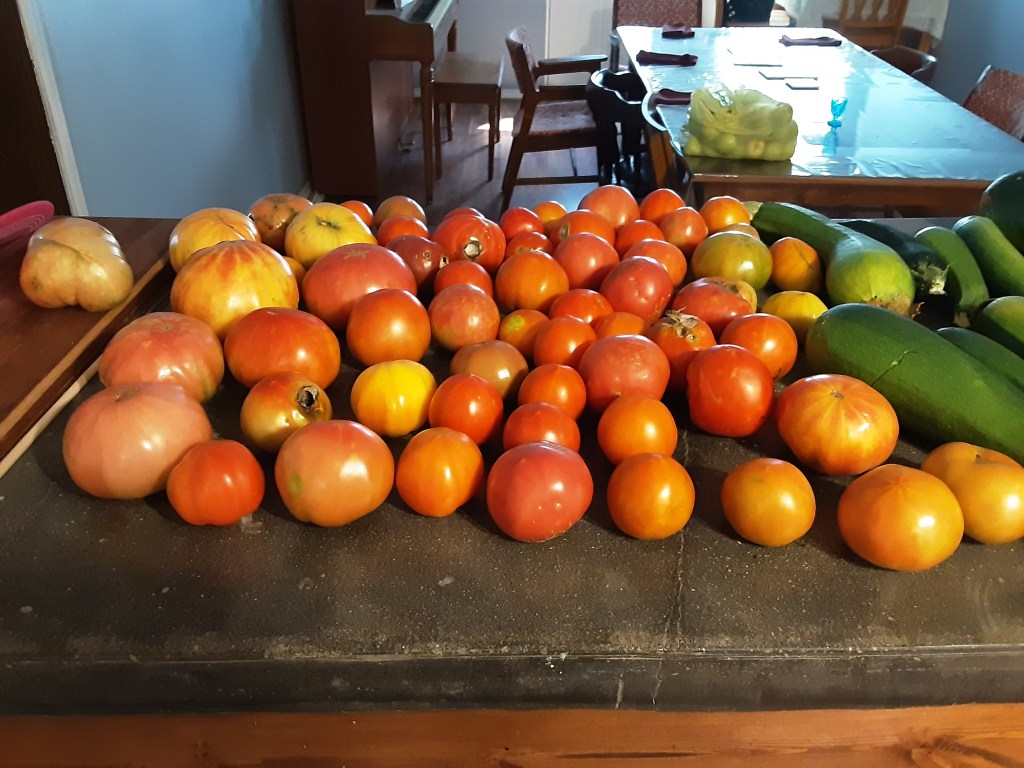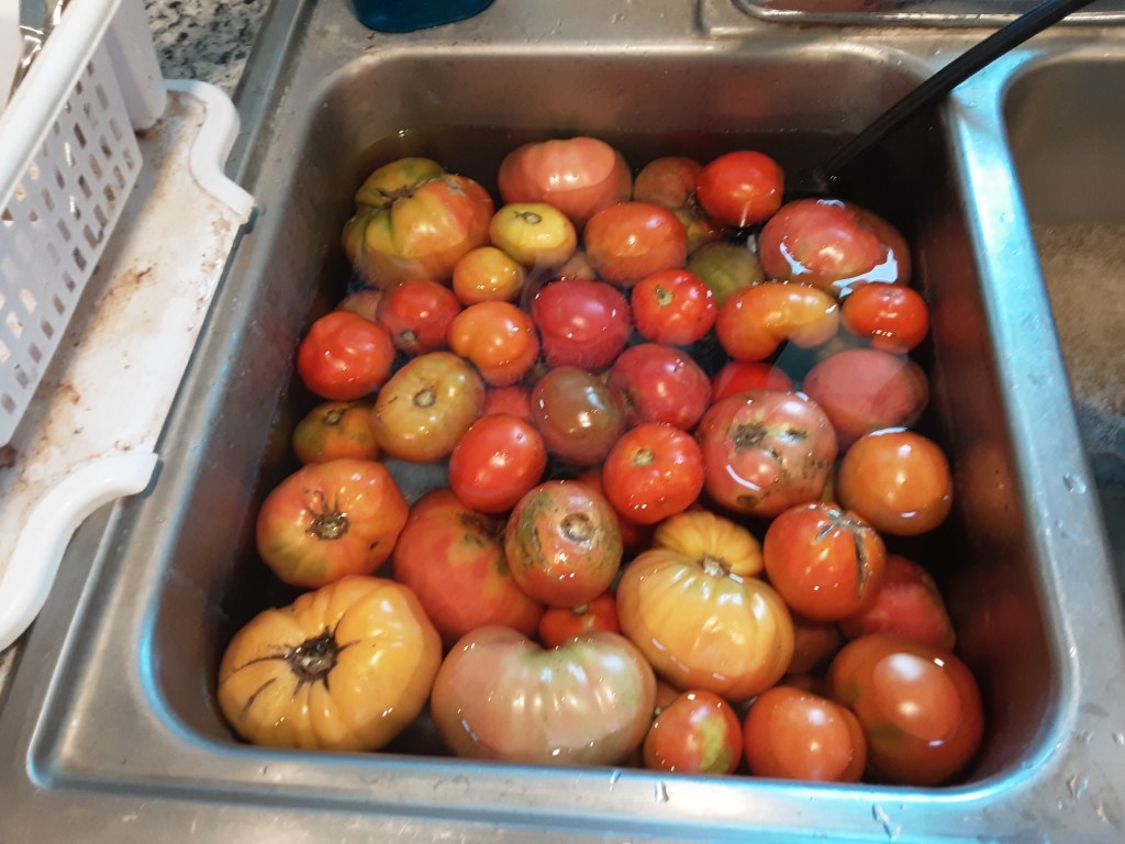 First you need to see the kind of tomatoes I am using. I am not using a “sauce” variety of tomato. I am using what I harvested from my garden and from the community garden. I have several varieties, but I don’t remember all of them right now. Off the top of my head, I know I have Ponderosa Pink, Cherokee Purple, Super Fantastic, Early Girl, Mr. Stripey, Arkansas Traveler, and maybe a Brandywine. This year I ended up growing more pink and purple tomatoes. Even though these are not the typical “sauce” varieties, you can make sauce from any kind of tomato. Don’t get caught up in having the perfect variety to make your sauce.