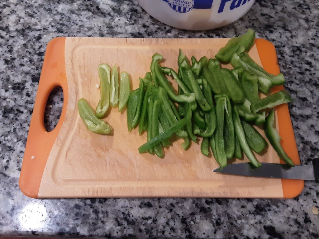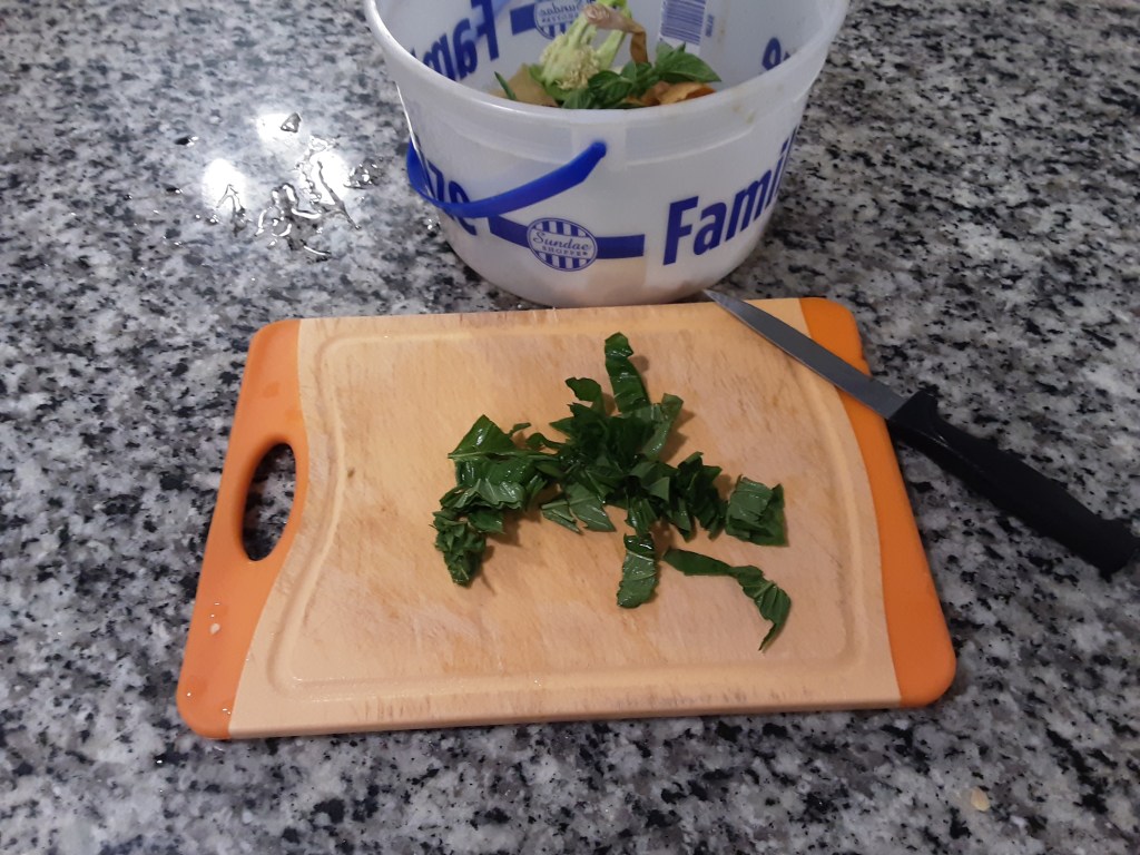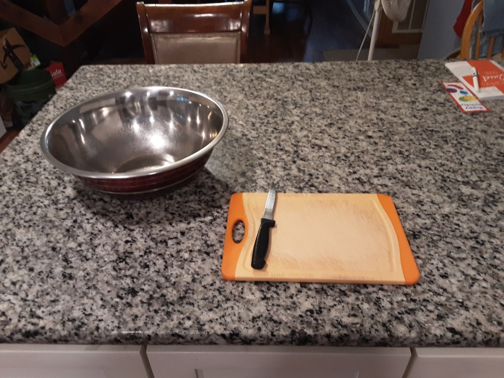 The next equipment I use are my largest metal bowl, my cutting board, and my serrated knife. I use a steak knife for cutting tomatoes because it cuts through the skin easier and quicker.
