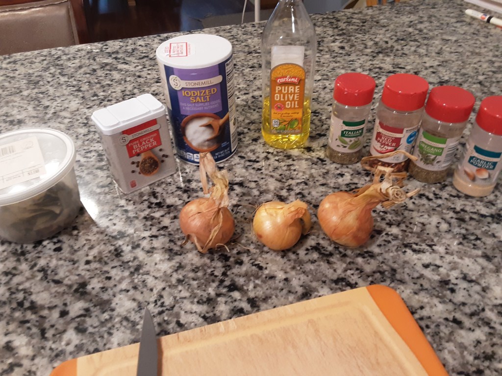 At some point during this process of prepping, I get out my seasonings and onions. You will need: Olive oil, Bay leaves, Salt, Pepper, Red Pepper flakes, Italian Seasoning, Garlic Powder, Oregano, and fresh Basil leaves.