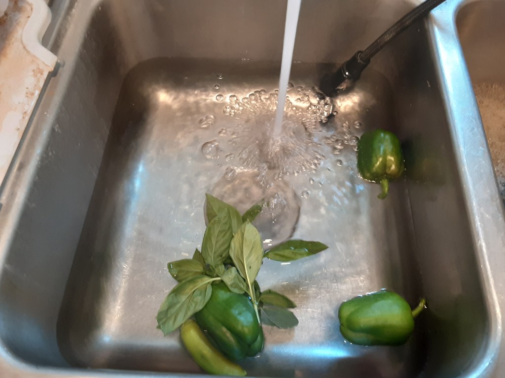 After I have these items out and ready to go, I start filling one side of my sink with cold water. The first thing I wash are my green peppers, Hungarian wax pepper, and my basil. These peppers don’t look quite like what you get from the store (as far as size), because I just picked them out of the garden.