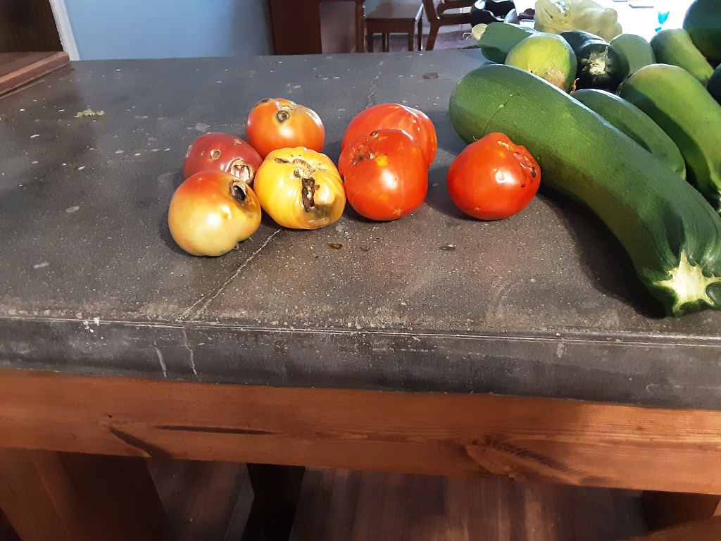 Now let’s have a look at these tomatoes. You might be tempted to throw away any tomato that looks like these. Yes, they have had some issues with bugs attacking them and the tomatoes are starting to look gross. However, these can still be saved and used for canning. Just cut away and discard the bad parts. You may cut away half of the tomato, but you still have half a tomato to use (the picture of the cut tomatoes is the good tomato I got out of the gross ones).