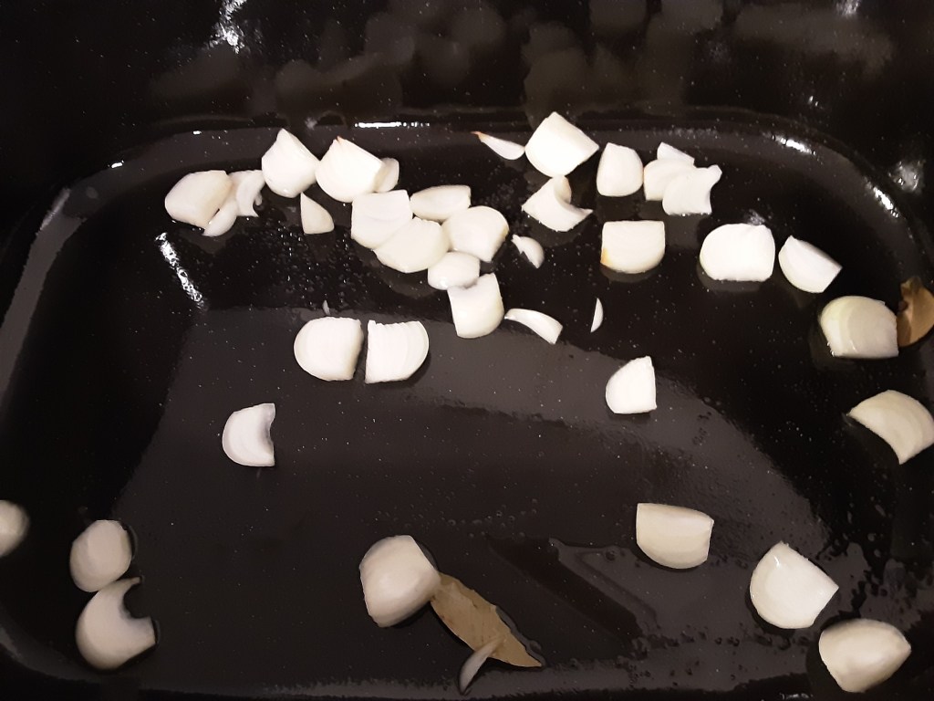 Once the peppers and basil have been washed, I move them to the counter and start putting my tomatoes into the sink to be washed. I had two bowls full of tomatoes (close to 17lbs). Once the tomatoes are rinsing, I put in a Tablespoon or so of olive oil and the bay leaves (one large or two small) into the pre-heating roaster. Then I proceed to cut up my onion into one-inch pieces. Again, my onions are small, because that is what I ended up growing this year.
