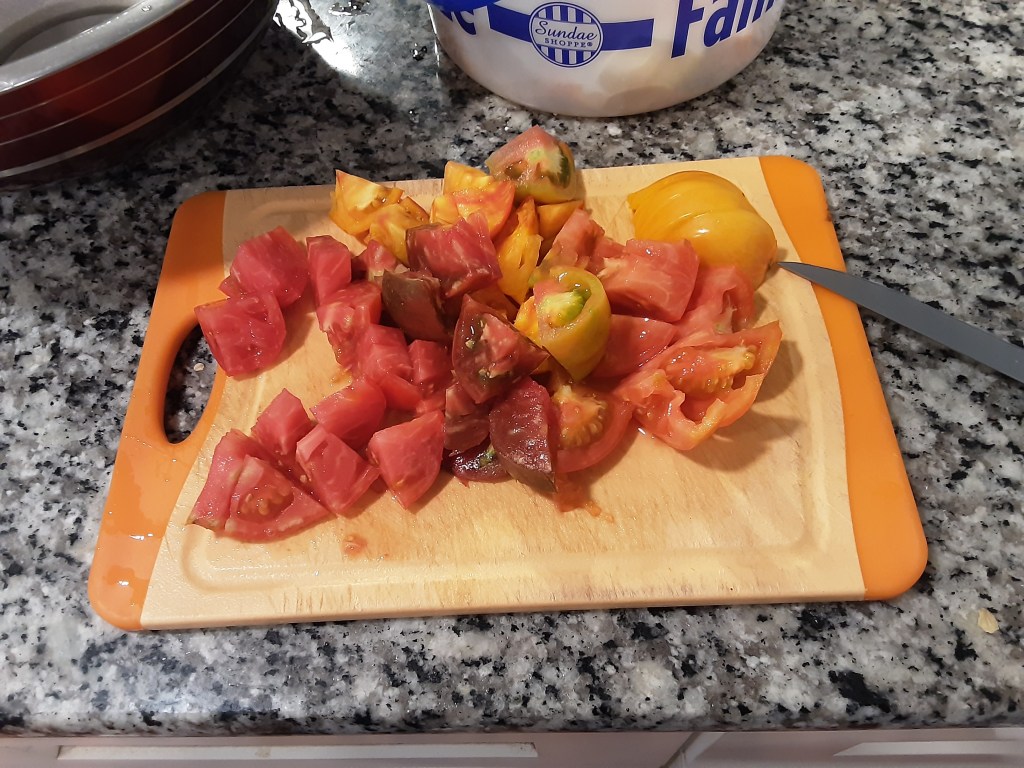 Now you get to the most labor-intensive part of day one sauce making. Remove the tomatoes from the water and place in your big bowl. Then one at a time, cut out the core of the tomato and then slice the tomatoes into chucks about the size you see in the picture. These tomatoes are going to be slow cooking for about 24 hours, so the pieces can be bigger than you might think. If you are using a regular store-bought tomato, think about cutting the tomato into quarters. My tomatoes have been much larger than store bought, so they need to be cut more than just in quarters.