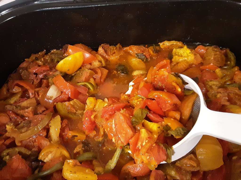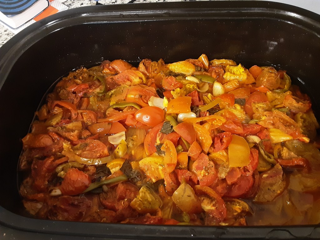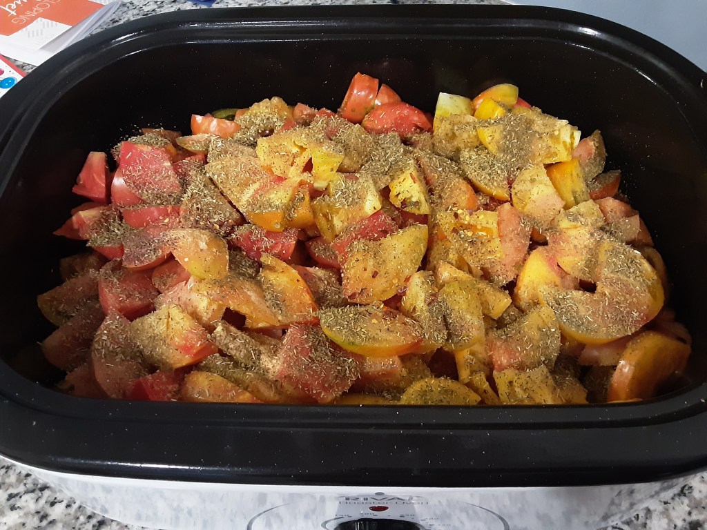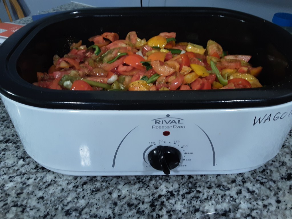 Pour in 1 Tablespoon of olive oil into the roaster. Cut up the onion into 1-inch chunks and the peppers into strips with seeds and ribs removed. Core the tomatoes and cut into 1-inch chunks and place into roaster. Cover vegetables with the remaining seasonings and then stir so that everything is coated well. Place on lid and slow-cook for 24 hours.
