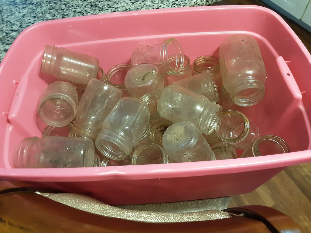 If you are like anyone else trying to can things right now, you know that canning jars are just about impossible to find. I was really in a bind, when my mom told me I could have her old jars she wasn’t using anymore. They had been stored outside in a tote under the porch. I know that these look a little dirty, but you need to know that I came home with 4 dozen jars: dirty gold.