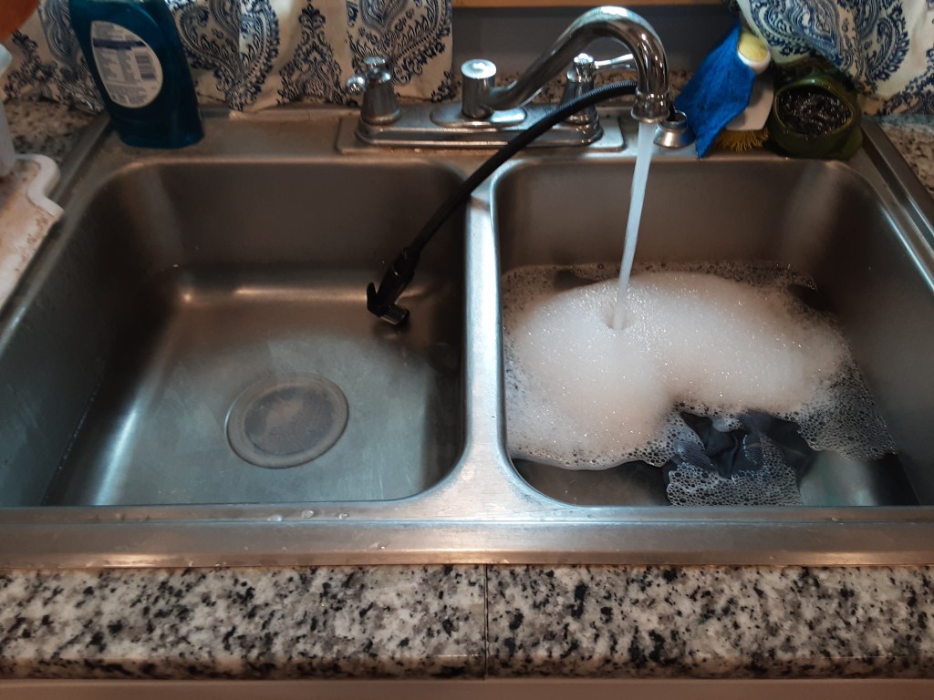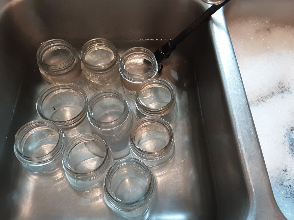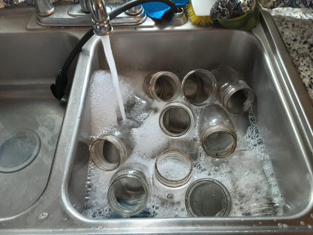 Regardless of whether you pulled your jars from under the porch or bought them new from the store, you need to wash the jars. Hot soapy water is needed to get them clean. Once they are clean, put them on a rack and then start fresh dish water and fill the rinse side of your sink half way with your hottest tap water.