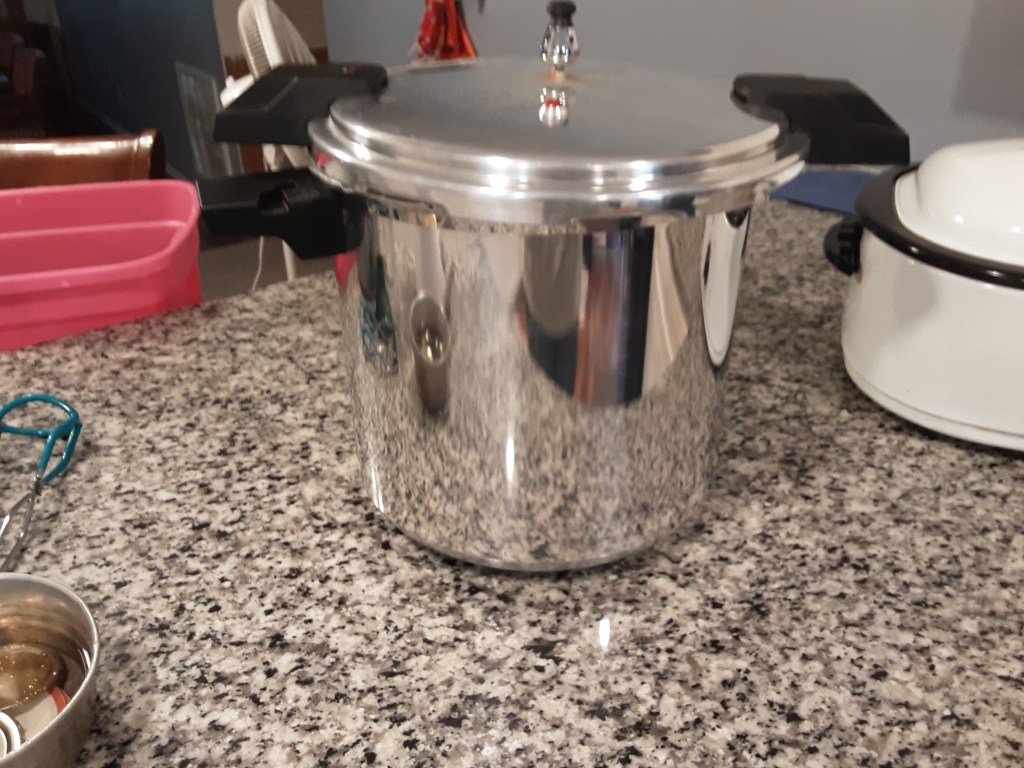 The next piece of equipment I have is my large pressure canner. This particular one can hold 7 quarts or 16 pints. Please be sure to read ALL of the directions that come with your canner, because they can be dangerous. I had one smaller canner have its safety valve explode on me this year. If I had been closer to it when the explosion happened, I could have been burned pretty severely. According to the directions for my area, I have the weight on the canner that sets the pressure at 10psi.