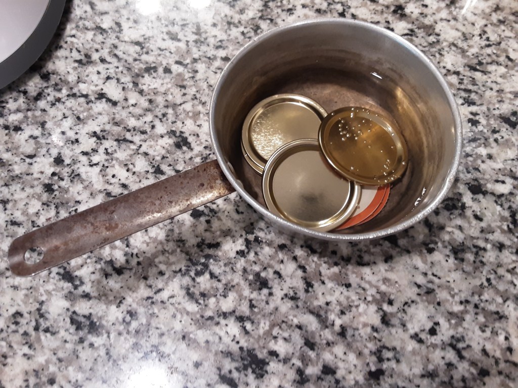 The next thing you need to do is get a small pan and put in your jar lids and cover with water. You will need to put these on the stove and bring to a simmer. This will sterilize the lids and activate the seal on them.
