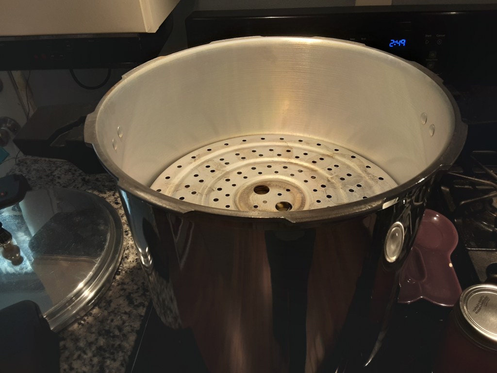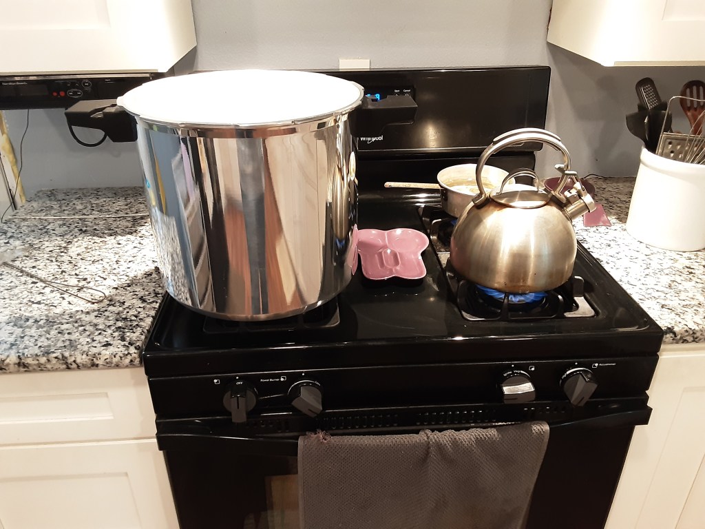 I now have my stove set up with more water boiling, the pressure canner filled with its 2 ½ cups of water (according to manufacturers’ directions) on medium low heat, and the lids simmering on a back burner.