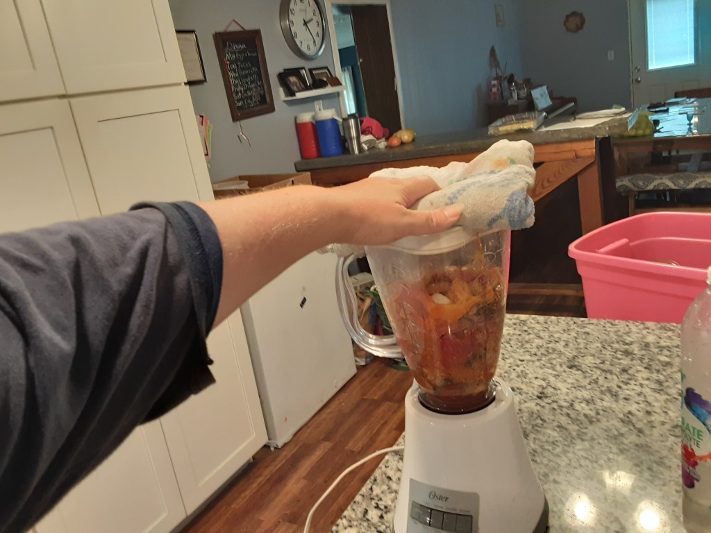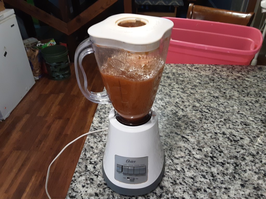 My blender is a key part to my particular sauce. If you notice I have the vent removed out of the lid. I will explain that later. Just know that if your blender has a vent in the lid, the vent will need to be opened or removed. You can also use a food processor if you don’t have a blender. This was a cheap $10 blender I bought in college. It is still holding out strong for me nearly 20 years down the road, so why go with anything else? Also please notice my bottle of water. You will need it, because canning is a hot, sweaty kind of job.