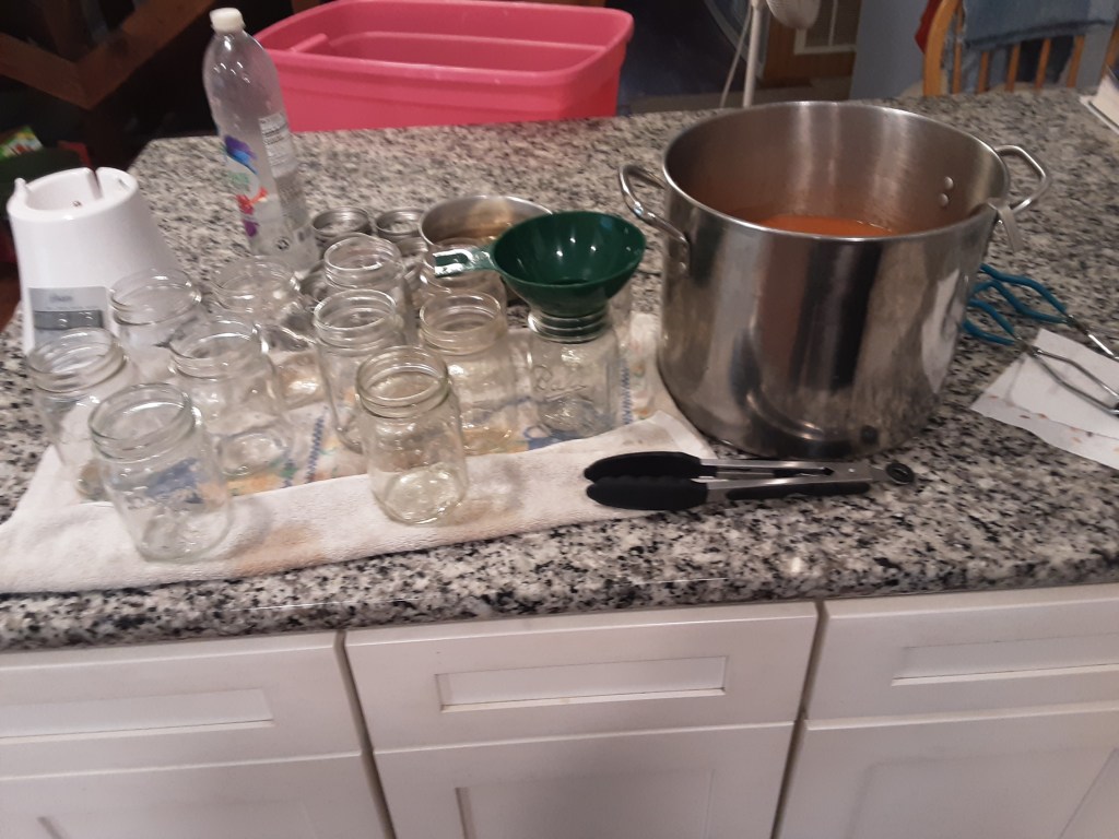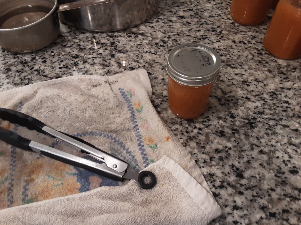 Use your jar lifters to remove the jars from either the canner or the hot water bath. Put the jars on a dry towel on your counter. They will need to cool overnight. You will hear jars make a popping sound. That means the lids are sealing and it is a good thing.