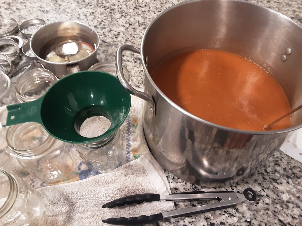 At this point, things are at a standstill until the next step comes of filling your jars. The jars are still hot, the pressure canner is warming up, the lids are simmering, and the sauce is still hot in the pot. Take a few minutes and wash your roaster, lid, and blender. With the dish water you already have ready, this should take five minutes or less, and it will save you lots of time later when you are not motivated to wash dishes.