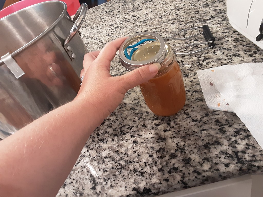 Stir your sauce and then start filling your jars. You will need to fill the jars, but leave an inch at the top (just under the threads of the jar) of what is called head space. Wipe the rim of the jar with the paper to towel to make sure it is clean and dry, place on a lid and screw on your ring. The ring needs to be snug, but not tight. Now move on until you finish your jars, following the same steps.