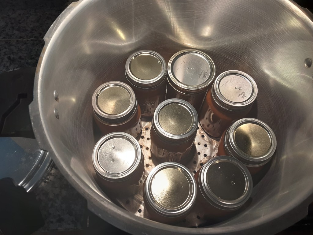 [If you don’t’ have a pressure canner, you can still make the sauce. You will need to use the hot water bath method (put your filled jars in a large pot and cover the jars completely with boiling water and boil for 20 minutes) ]