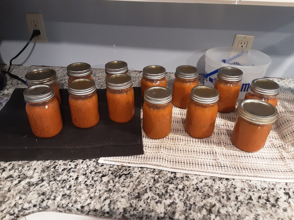 This batch made thirteen pints and one, half pint. The half pint was super full, so I put it in the fridge to use over the next month when I need a little sauce for something (just the right amount for a stuffed green pepper casserole).