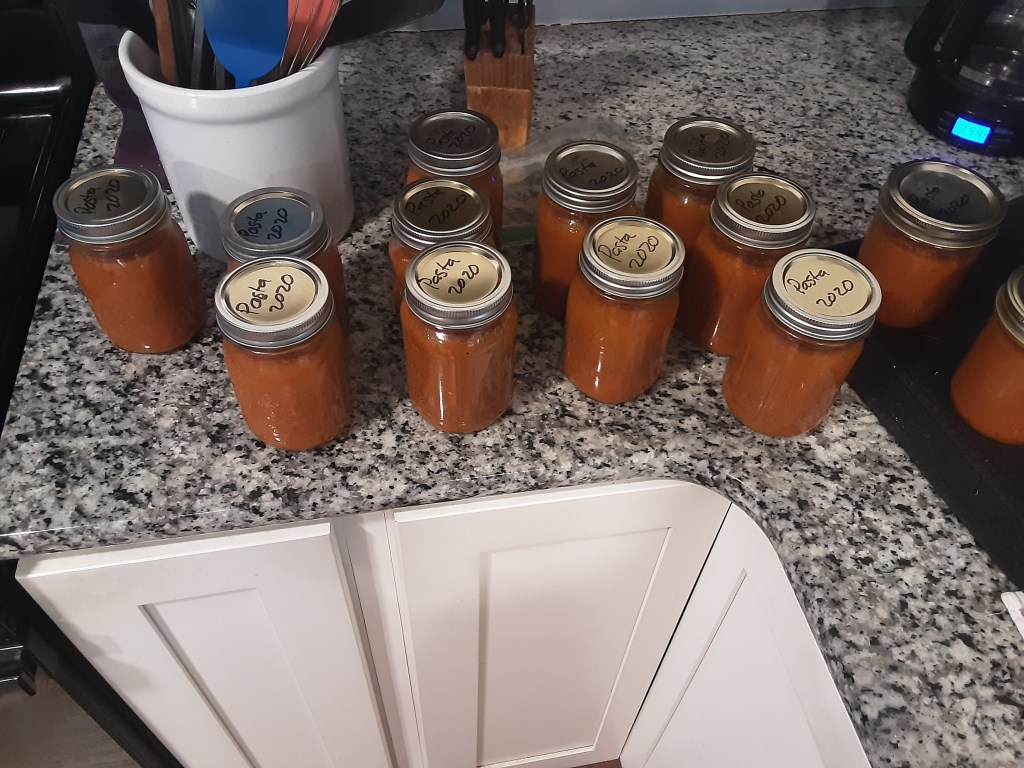 Finally use a sharpie to write what it is that you made and the year. Jars will start to all look a like after a while on your shelf and it will be good to know if that is a pasta sauce, pizza sauce, or chili base.